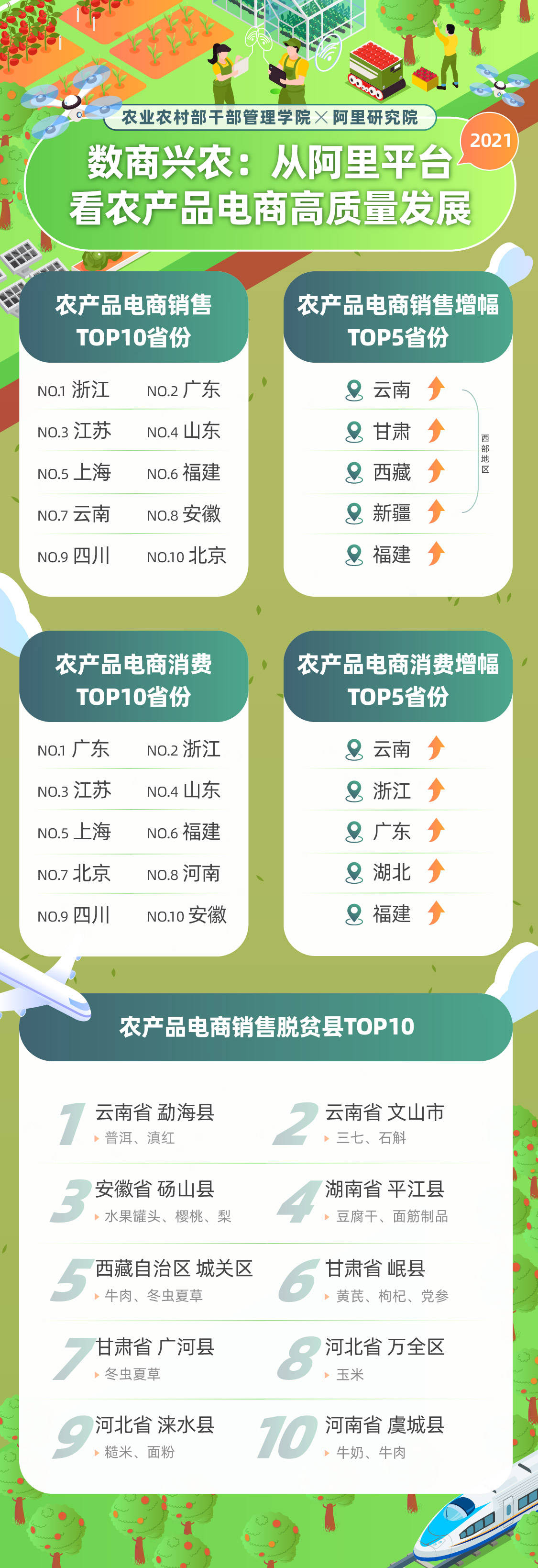 4月24日,农业农村部管理干部学院、阿里研究院联合发布《“数商兴农”:从阿里平台看农产品电商高质量发展》(以下简称《报告》)。 《报告》认为,阿里进一步加大农业产地端投入,设立数十个产地仓与1200余个菜鸟乡村共同配送中心,持续建设1000个数字农业基地,与消费端近场电商等新业态结合,更高效连接农民与消费者,让数据逐渐成为增产增收的“新化肥”。 《报告》指出,农产品电商迈入高质量发展阶段,呈现出四大趋势:一是数字化从餐桌延伸到土地,数据成为新型农业生产要素。二是数字技术弥合东西部差距,西部农产品电商搭乘新基建进入快车道。三是近场电商改造农产品供应链带动鲜花首次进入销售品类前十。四是“红美人”效应愈发明显,一批县域通过数字技术打造区域公用品牌,从农业大县迈向农业强县。 西部四省包揽增速前四 云南依托新基建获消费、销售增速双料冠军 从销售来看,增速排名前五的分别为云南、甘肃、西藏、新疆、福建,前四被西部省份包揽,充分证明西部农产品电商潜力正在显现。 其中,云南表现尤为突出,消费销售增速均为全国第一,其中销售同比增长30%,排名从全国第10跃升至第7,销量前三的农产品为普洱、多肉植物、鲜花,同比增长分别为76.5%、12.9%、87.3%。脱贫县销售排行榜前二也被云南省包揽,分别为勐海县和文山市。 《报告》分析认为,云南农产品电商成绩喜人主要得益于三个方面:一是云南政府不断加大投入开发本省丰富的农业资源。二是2020年9月阿里设立云南公司,菜鸟、淘菜菜、盒马、数字农业等业务相继入滇或加大投入,持续提升当地农产品供应链效率。三是受疫情影响,不少做农产品贸易的商家“出口转内销”,通过盒马、淘菜菜、淘宝直播等拓宽国内销售渠道。 云南新平县是冰糖橙之乡。2019年菜鸟共配中心落地新平,畅通乡村物流。2020年新平进一步建成菜鸟农产品智能产地仓,不仅能对冰糖橙进行数字化分选提高附加值,还可以就地发货直销阿里等平台。 新平快递单量从10年前的每月72单,增长到如今每月80万单,其中三分之二是农产品销售快递。2021年冰糖橙上市期,通过菜鸟产地仓卖出40万单、1800吨橙子,每单物流成本下降0.3元,带动200多当地农户就业。 截至目前,菜鸟乡村共配中心自动化改造已服务全国25个省的150余个区县,而智能产地仓也将深度服务30个以上的县域。数字化正不断从餐桌延伸到土地,数据正成为助农增收的“新化肥”。 《报告》指出,数字技术有助于破解区域发展不平衡格局,因为缩小数字鸿沟比消除工业基础设施的差距更容易。西部普遍为农业大省,通过搭乘电商等数字新基建,优质农产品越来越多的走上全国消费者的餐桌。 鲜花首次进入销售榜前十 近场电商改造提升农产品供应链 《报告》显示,农产品电商销售前十分别为纯牛奶、普洱、混合坚果、大米、鸭肉零食、牛肉、鲜炖即食燕窝、酱类调料、鸡肉零食、鲜花。 《报告》分析认为,三类农产品在电商渠道最受欢迎,一是深加工农产品,包括纯牛奶、肉类零食、酱类调料等。二是耐储运农产品,包括普洱、混合坚果、大米等。此外,受益于淘菜菜、盒马、天猫超市等近场电商崛起,鲜花、鲜炖即食燕窝等对冷链物流效率要求较高的商品,也成为线上消费新宠。 鲜花行业数字化升级步伐较慢,究其原因,是因为鲜花比一般蔬菜、水果更娇贵,对温控、品质、成熟度要求更高,且非常易损,很难通过原产地包裹直发消费者,属于生鲜中最难啃的“硬骨头”。 盒马于2019年开始探索鲜花业务,截止到2022年3月在全国共签约近40个鲜花直采基地,并搭建鲜花产地仓。鲜花从产地仓、销地仓、盒马门店,最终到消费者手中,实现从乡村到城市的全链路数字化,让鲜花提质降损。 《报告》认为,近场电商模式的价值是能让人、货、场更精准匹配,通过打通供应链全链路数字化,反向推动农业基地确定性供应,最终实现订单农业。这种对农产品供应链的改造,让鲜花等易损农产品大规模网购成为可能。 农产品数字化百强县榜单出炉 “红美人”效应愈发明显 《报告》公布了农产品数字化百强县名单,福建安溪(铁观音)、江苏沭阳(鲜花)、福建武夷山(大红袍)、福建福鼎(白茶)、江苏丰县(樱桃)、江苏兴化(坚果)、江苏东海(鲜花)、江苏邳州(鲜花)、浙江义乌(养生茶)、江苏新沂(核桃仁)位列前十。 从省份来看,山东有17个县市入围,之后依次是江苏(14),浙江(11),福建(9),安徽(7),东部四省合计超过百强县一半,地区优势明显。西部省份共有陕西、云南、广西、四川、甘肃、宁夏6省的15个县市上榜,比去年多25%,进步明显。 《报告》还公布了课题组调研的农产品数字化百强县优秀案例:浙江象山。 “红美人”是浙江象山县2001年选育出来的高端柑橘品种,2021年象山红美人由国家知识产权局批准注册成为国家地理标志证明商标。 象山红美人糖度合适,口感如果冻,每公斤售价50-120元,被消费者称为“橘中爱马仕”。当地农户陈忠林拿出4亩地搭建温室大棚,嫁接试种,第二年4亩地就卖了50多万元。 但“顶流”也面临“成长的烦恼”。随着全国引种越来越多,“红美人”遍地开花。果箱上打着象山红美人,发货地却在天南海北,且价格出奇便宜,品质与正品天差地别,象山红美人声誉面临极大挑战。 2020年起,象山当地与阿里巴巴数字乡村事业部合作,引入